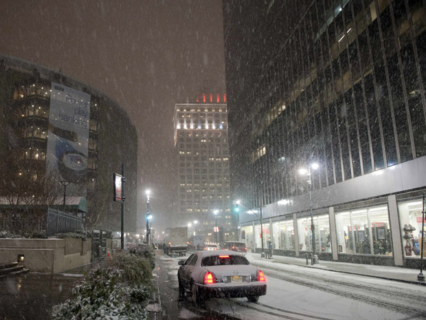 Neve cai diante do Madison Square Garden, em Manhattan, na noite desta terça-feira(11).